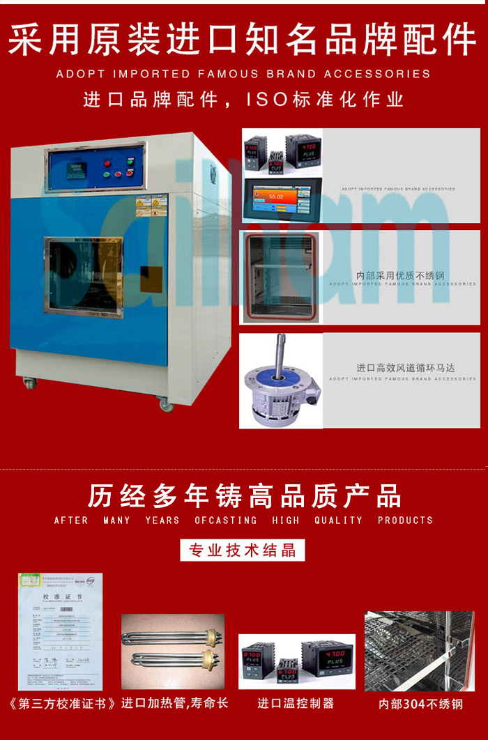 4、采用耐高溫、噪音小、振動小電機,同時應用渦輪型風輪,風壓強風量大,有效的使箱內(nèi)熱風循環(huán)流暢,使溫度均勻性高。