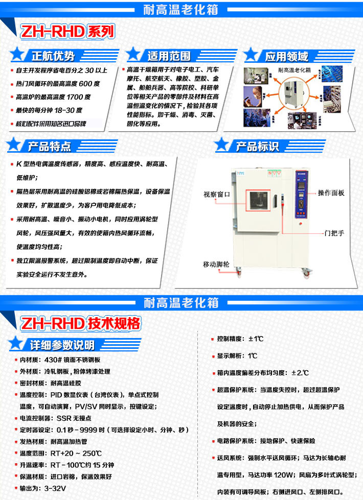 用于對電子電工、汽車摩托、航空航天、橡膠、塑膠、金屬、船舶兵器、高等院校、科研單位等相關(guān)產(chǎn)品的零部件及材料在高溫恒溫變化的情況下,檢驗(yàn)其各項(xiàng)性能指標(biāo)。嚴(yán)格按GB/T2423.2-2008高溫老化試驗(yàn)方法制造。